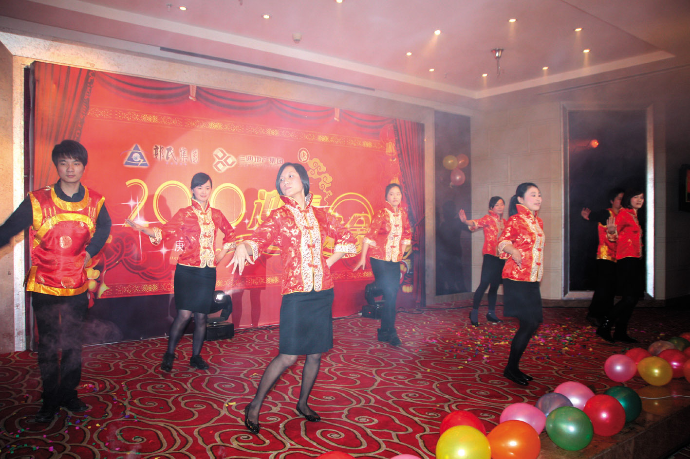 迎春晚会由外联部和红、谢蕾主持。集团常务副总裁周敏凯就2009年工作进行了简短的总结,并对所有为郭氏集团发展做出贡献的员工表示了感谢。晚会正式拉开帷幕,全体员工观看由郭氏员工自编、自导、自演的迎新晚会。期间郭加迪董事长及集团各位副总裁为每位获奖的优秀老员工等颁发荣誉证书及红包。表彰大会后的大抽奖掀起了全体员工的极大热情。整台晚会气氛热烈、高潮迭起。佳作纷呈的即兴表演不但彰显了员工们的个人才艺,更体现了企业的团队凝聚力和同事之间良好的合作精神,增进了企业的文化建设。 【郭氏集团 魏诗丽/字】