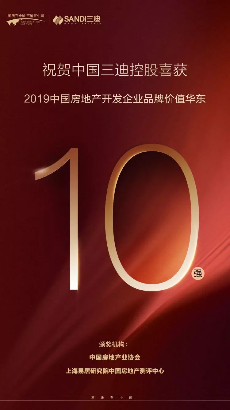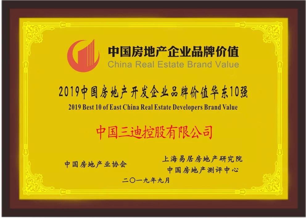 9月19日,由中国房地产业协会、上海易居房地产研究院、中国房地产测评中心共同主办的"2019中国房地产企业品牌价值测评成果发布会暨房地产品牌发展高峰论坛"在云南抚仙湖隆重举行。会上发布了2019中国房地产优秀品牌企业名单,中国三迪控股凭借强劲的竞争力荣获“2019中国房地产开发企业品牌价值华东10强”。