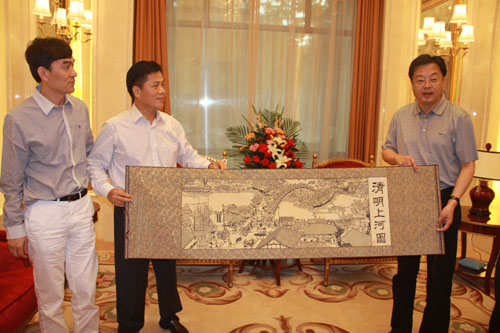 会后赵静波市长与郭氏集团郭加迪董事长、帝源置业董事长张锦林互送纪念品合影