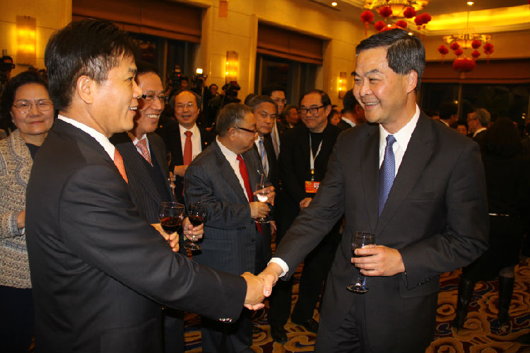 香港特别行政区行政长官梁振英3月4日在北京主持招待港区全国人大代表和政协委员的酒会。梁振英表示,要珍惜目前香港经济发展基本良好的局面,发挥好“一国两制”的优势。当天的酒会除了参加本次两会的港区全国人大代表、政协委员出席外,特区政府还邀请部分驻北京的香港商会代表和专业人士。这是郭董第二次在北京参加港区的代表委员。