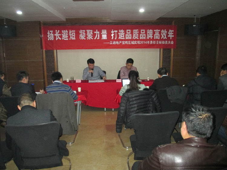 在报告中周总向大家讲解了宝鸡区域公司2014年各项责任目标情况,并就如何实现年度责任目标做了精心的部署与安排。周总指出“为扎实有效推进区域公司各项工作,宝鸡区域公司2014年要认真推行全员营销战略,优化完善组织与岗位设置、全面升级各项管理体系与管理模式、明确各管理职责,切实加强现场监管、确保工程质量,有效解决现有的困难与问题,从设计、工程质量、报建报批、样板房、景观绿化、物业服务、言行举止、宣传推广等环节全面提升企业竞争力,用心经营,全力打造三迪品质品牌。