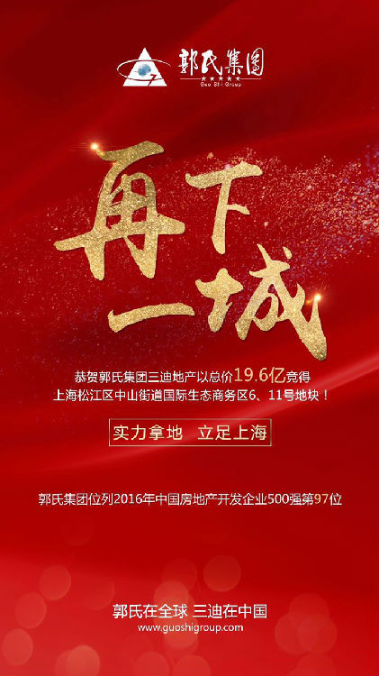 [摘要]:2016年8月26日,三迪地产击败20余家知名企业,成功竞得上海市松江新城区EBD商务区N6、N11号地块。该地块土地面积73506.7平方米,成交价19.6亿元,溢价率183%。