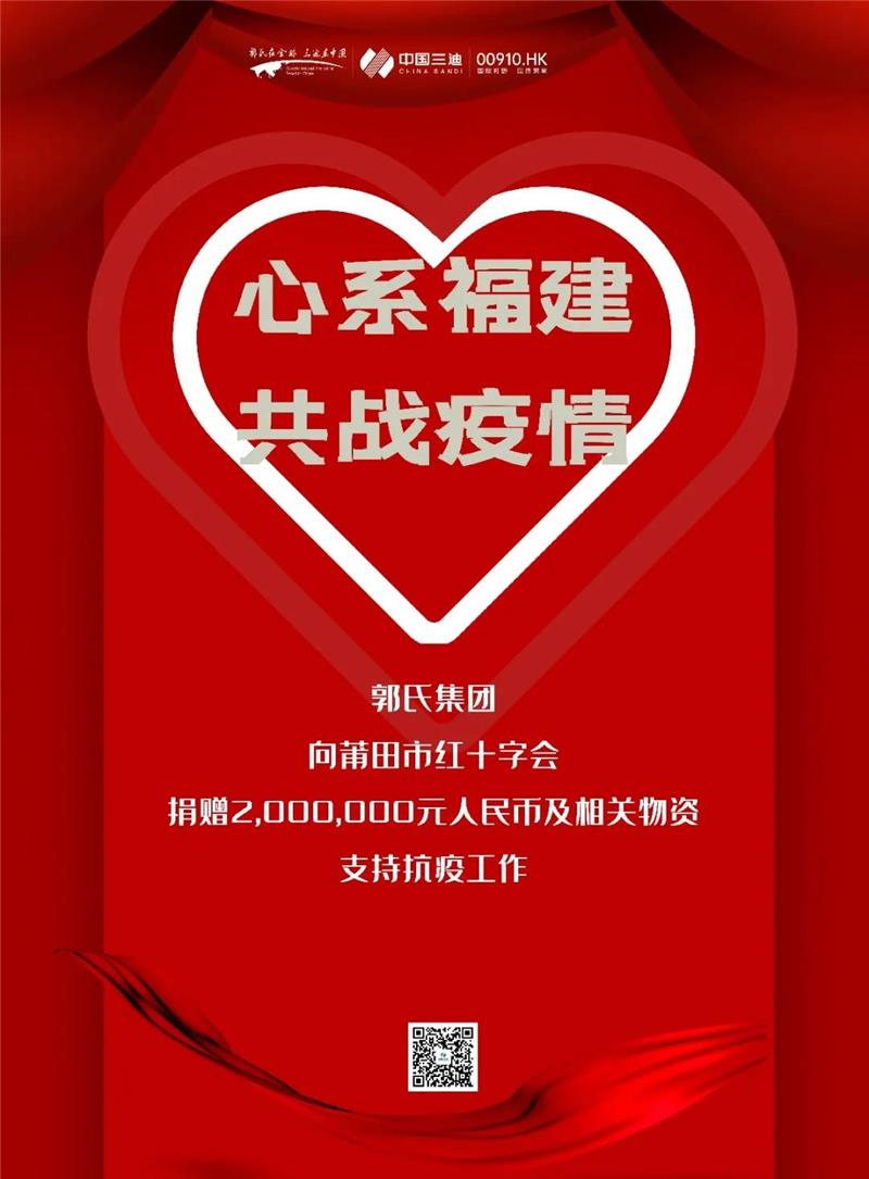连日来,发生在福建多地的新冠肺炎疫情,再次牵动了每一个人的心。9月18日郭氏集团董事长郭加迪通过福建省委统战部、福建省侨联,向莆田市红十字会捐赠200万元人民币,该笔捐赠将用于当前福建疫情的防控工作,自2020年疫情发生以来,郭氏集团已累计捐款超420万元人民币及相关物资。