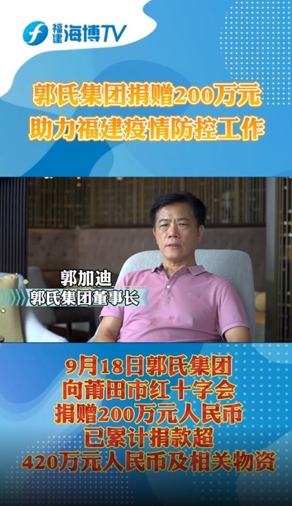 连日来,社会各界心连故土,踊跃捐款捐物支援福建抗疫工作,频频刷屏朋友圈。在防控疫情的关键时期,郭氏集团董事长郭加迪带头捐赠200万元,以实际行动支持防疫工作,并发动华侨、华人及侨界社团组织捐款捐物,呼吁海内外侨界同心协力,展现了企业的社会责任感与使命感,体现了企业家积极回报社会的大爱之心,彰显了爱国闽商坚定前行的红色信念。
