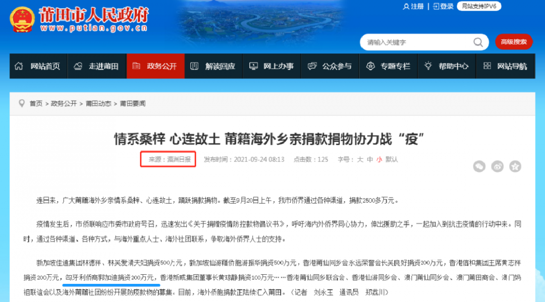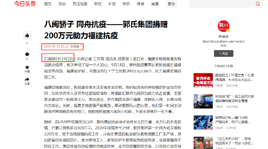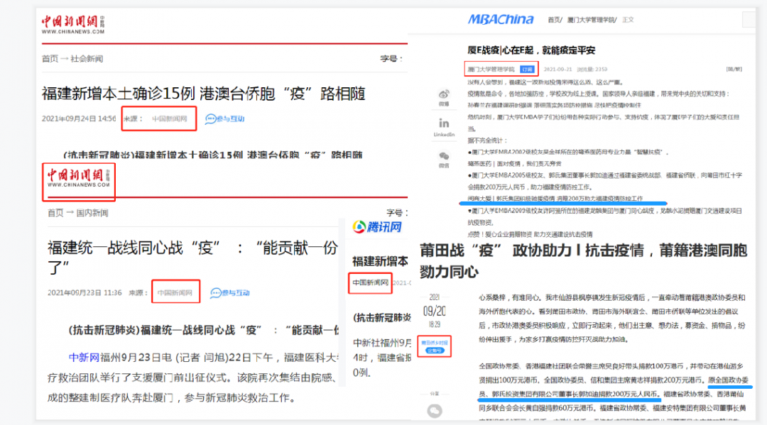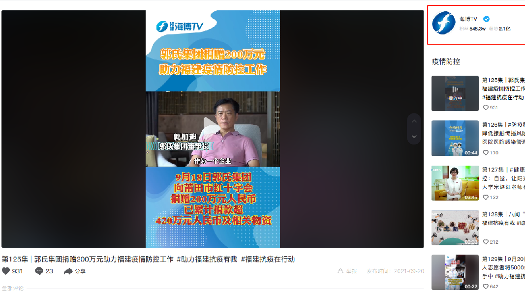 此次董事长郭加迪带头发动捐款200万元,郭氏集团助力福建抗疫的事迹,被中国侨网,福建日报社,福建电视台及海博TV、湄洲日报等权威媒体多方报道,在腾讯、网易、搜狐、头条、百度新闻等各大自媒体平台上广为传播。